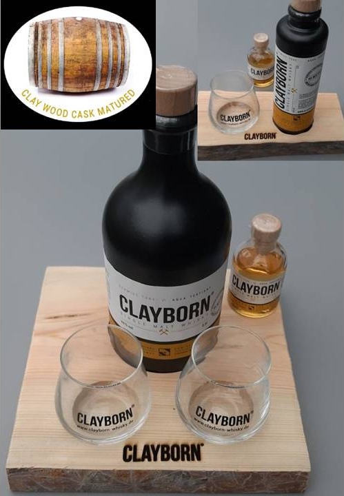- 1x Holzplatte aus ehemaligen original Holzstempeln des Tiefbaus auf Ton im Westerwald - 1x Clayborn WHISKY, 46 %Vol., 50cl - 2x Clayborn Tasting-Glas - 1x CLAYBORN WHISKY Mini, 46 %Vol., 5cl