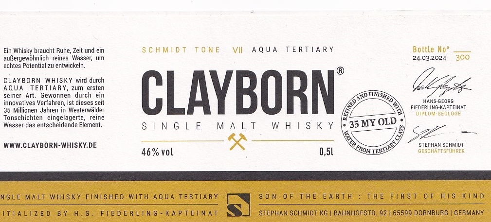 Die Verbindung aus einem reinen Wasser, das seit 35 Millionen Jahren im Westerwälder Ton eingebunden war und einem Single Malt Whisky, Das Ergebnis ist ein Whisky mit intensiven Aromen von dunkler Schokolade, vollreifen Früchten, Karamell und Zigarre. Klassisch, erdig, mit eleganten Zitrus- und Haselnuss-Noten.